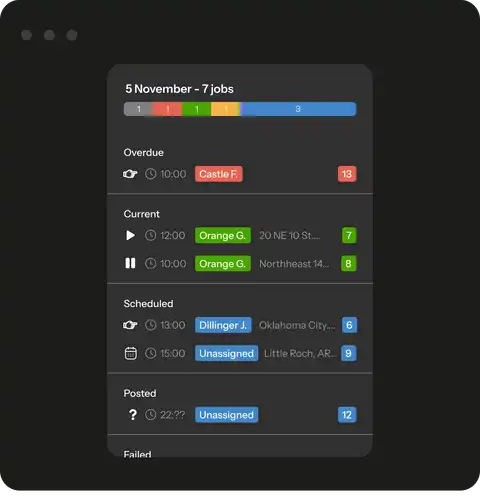 You will find out immediately when an employee sets off for a job or starts working on it. The dispatcher will receive the updated information on the jobs instantly once your workers go online using their smartphones. The application updates the information automatically every 2 minutes.