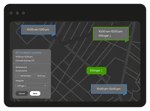 Assign a worker for jobs directly from the map. It is convenient to assign jobs that are nearby to the worker using the map. When planning, you can apply a filter by type of work and select a convenient scale to plan only a certain area (menu - Map , view type - Jobs).