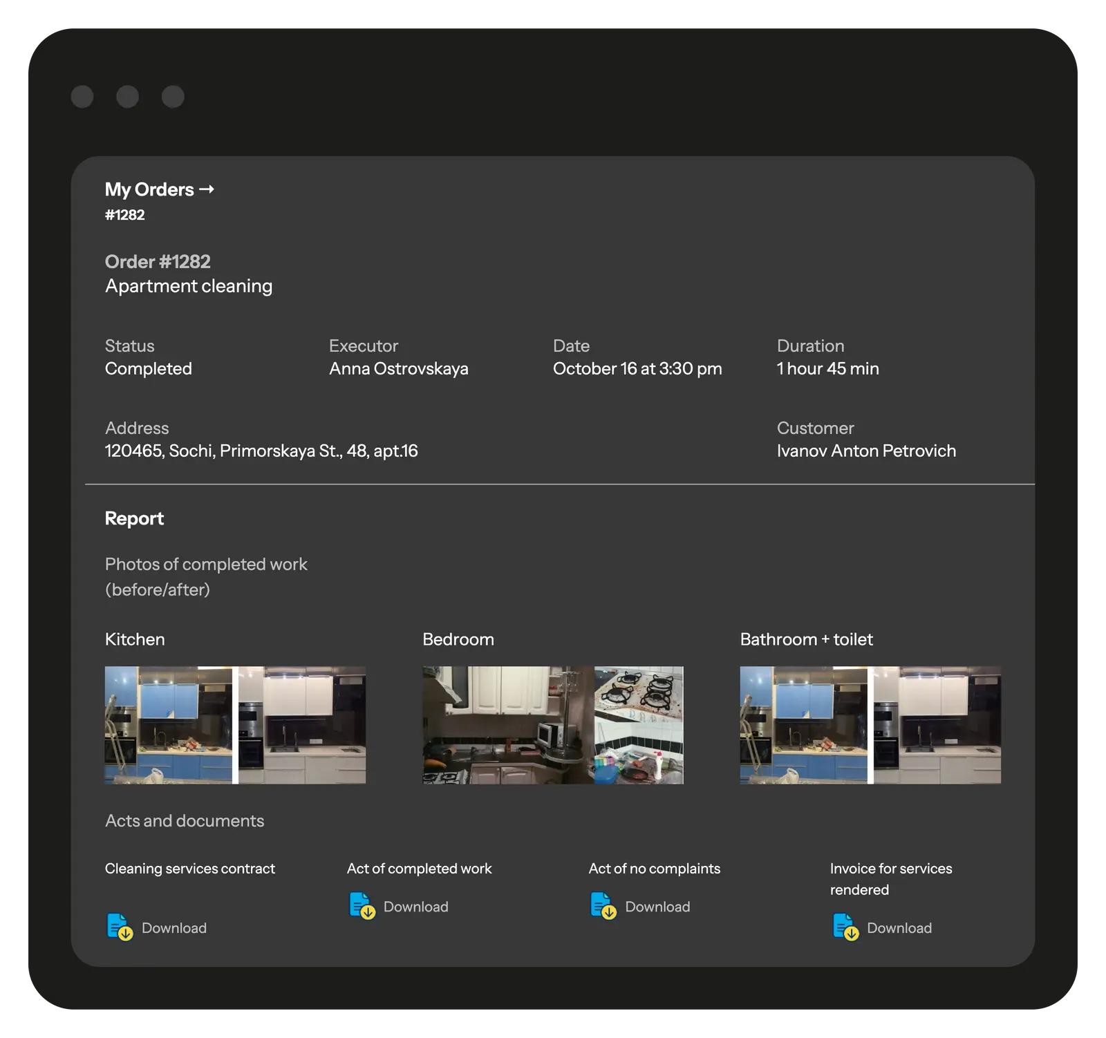 Clients can track job status in real time, view photo reports, and even submit new requests — all in one click..