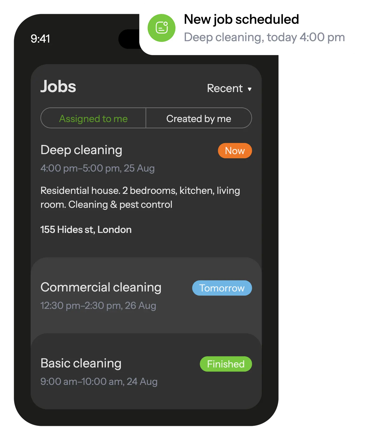 Within the mobile app, cleaning staff can view all scheduled jobs and get alerts on new tasks assigned to them.