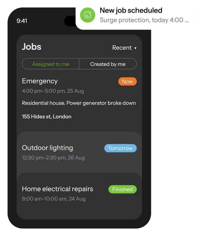The mobile app keeps electricians informed about scheduled tasks and updates them with new assignments via notifications.