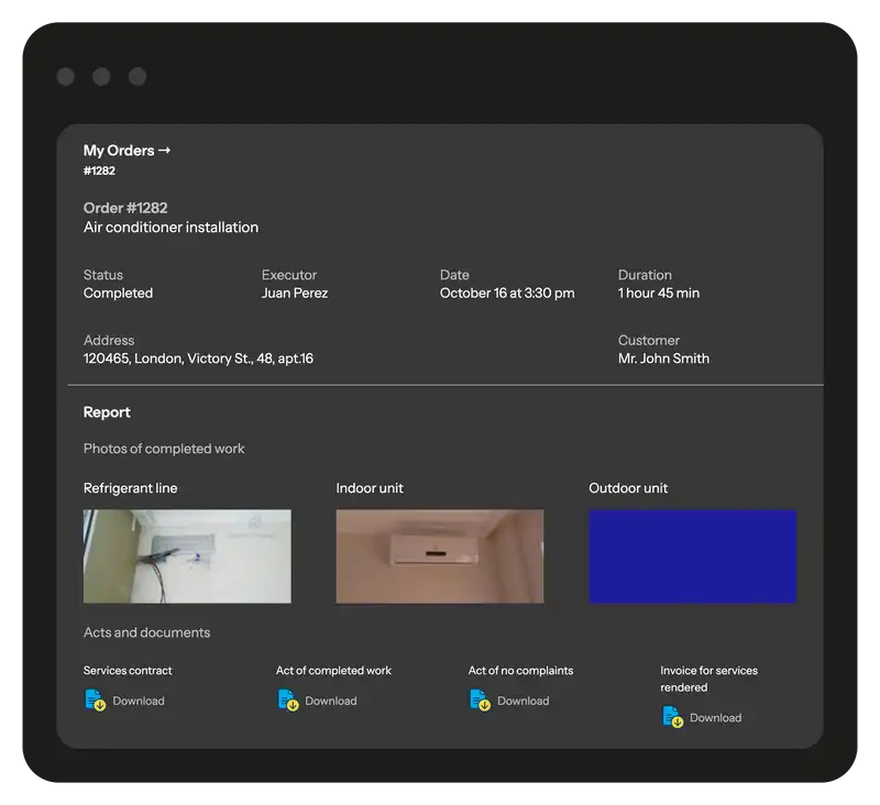 Upon completing a task, the technician submits a detailed, customizable report including photos, which is automatically saved to the database and shared with the office.