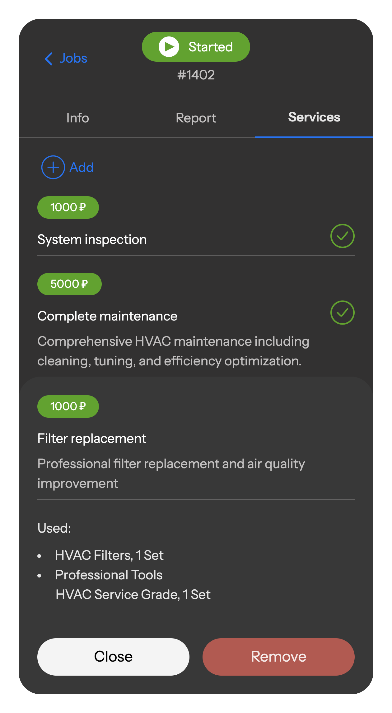 Technicians record all used chemicals, consumables, and services directly in the mobile app. Everything is automatically logged, added to the report, and sent to the office — ensuring accurate records and full accountability.