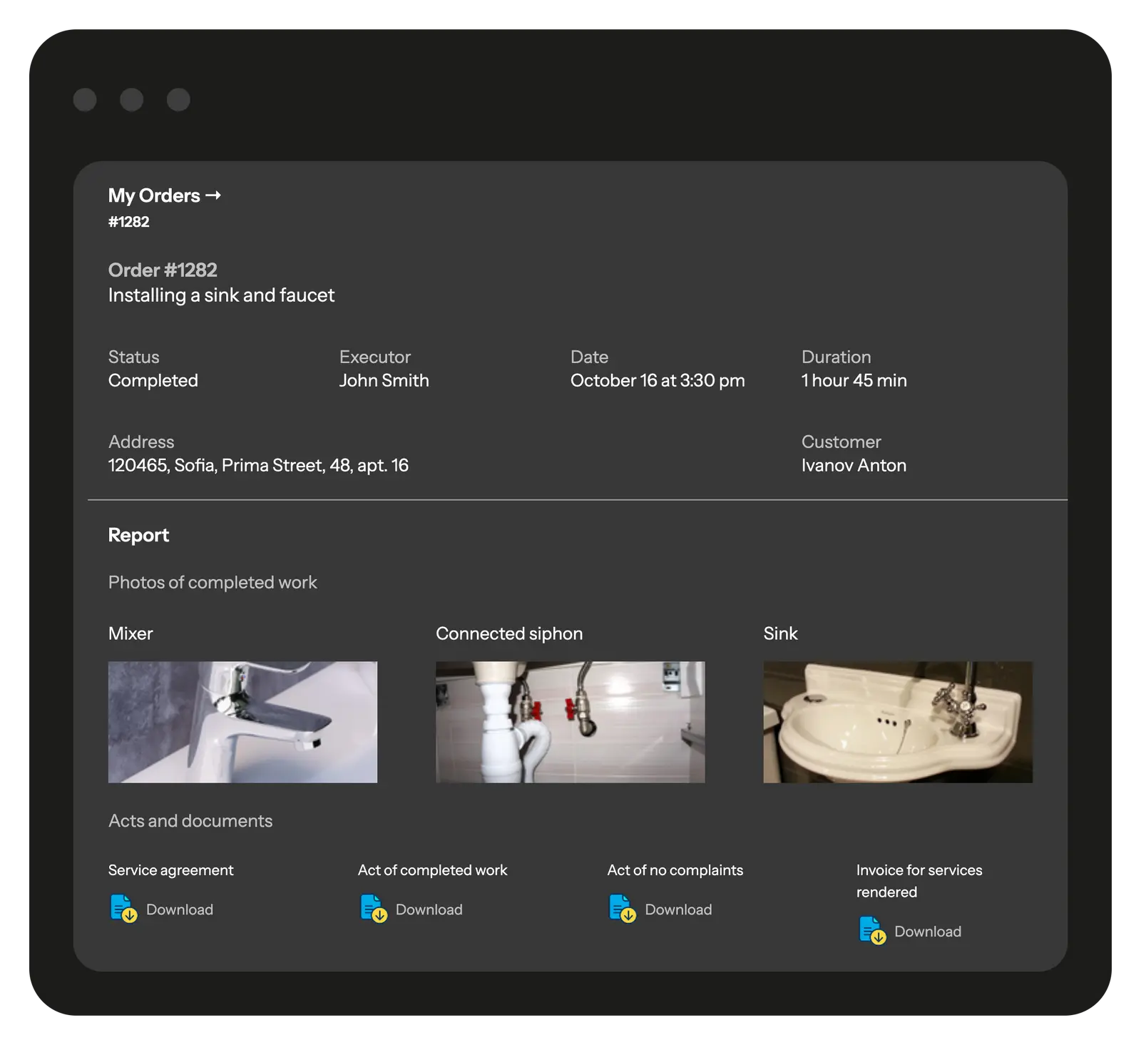 Clients automatically receive SMS or push notifications at every stage: request accepted, technician en route, job in progress, job completed. They also receive photo reports and can provide instant feedback after service completion.